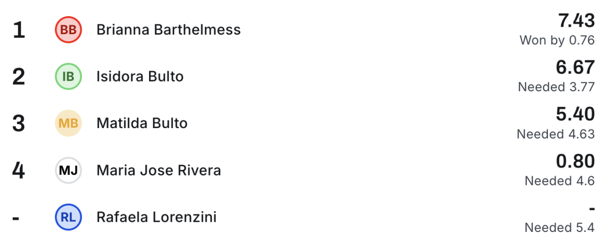 La peruana marcó 7,43 de sumatoria para dejar en segundo lugar a Isidora Bultó y en tercero a Matilda Bultó. En cuarto se ubicó María José Rivera.
