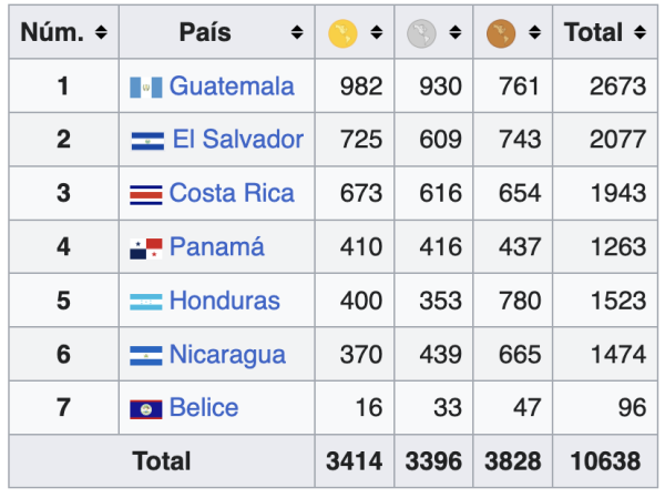 -En el medallero histórico, Guatemala es el más ganador por bastante con 982 medallas de oro, 930 de plata y 761 de bronce, totalizando 2673 preseas.