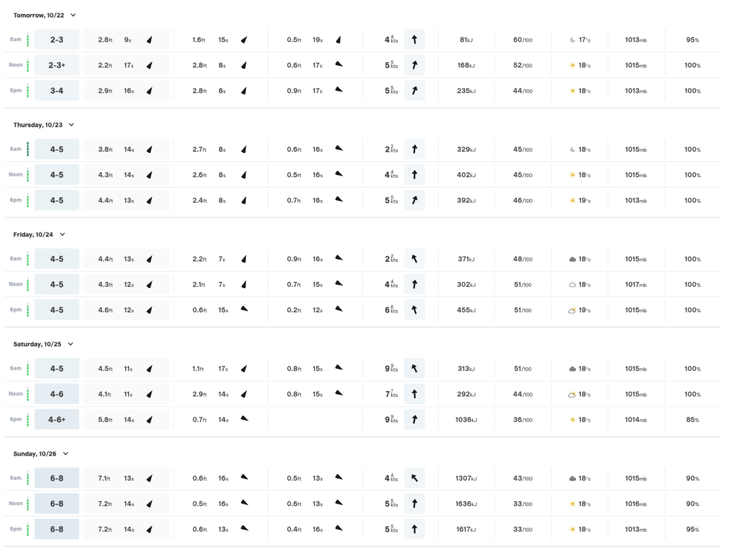 Surfline detalla que el mar estará mejor que hoy con 2 a 3 y hasta 4 pies mañana. Y sigue subiendo, con el jueves y viernes manteniéndose con 4 a 5 pies y luego, un fin de semana que sube: El sábado con 4 a 6 y un domingo de 6 a 8.