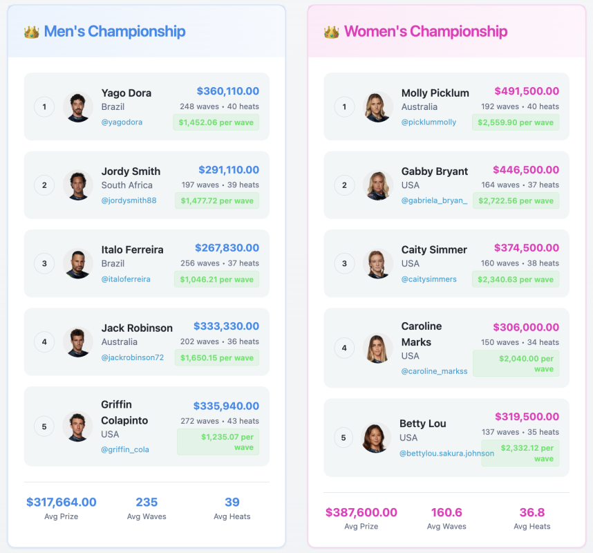 -For each wave surfed, men earned an average of $1351 and women $2413.