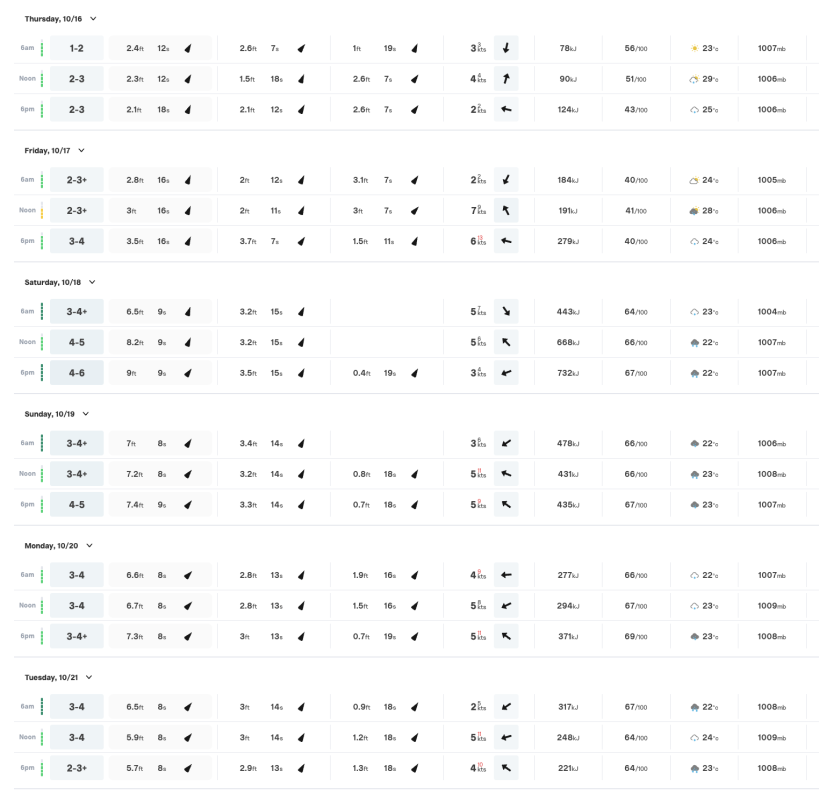 The 17th will break with 2 to 4 feet and a period of 16 and the 18th will be the biggest day with waves reaching up to 6 feet, the size increases but the period decreases and the conditions remain good throughout the day.