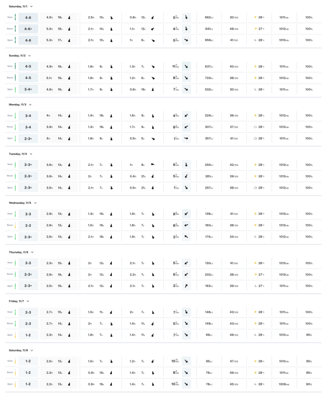 Luego, entre el 4 y el 8, los días del evento, el mar baja como le gusta a esa ola y se mantiene en el entorno de 2 a 3 pies, con excepción del día final que marca 1 a 2 y condiciones no tan buenas.