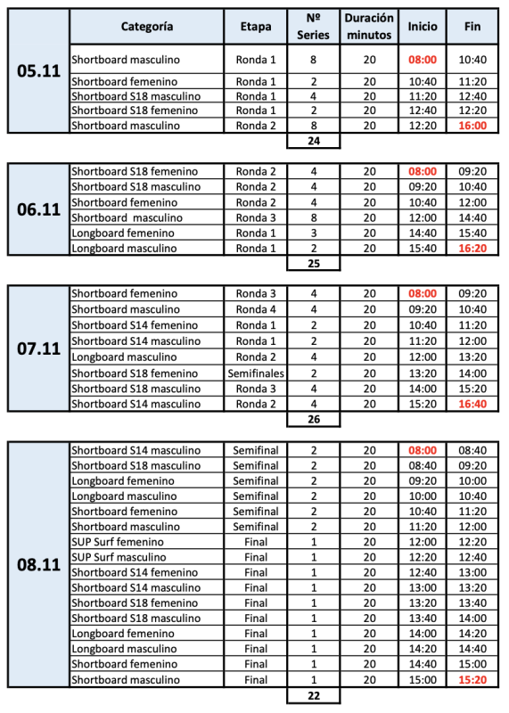 97 series serán necesarias para completar el evento y consagrar a los campeones en las 10 divisiones en disputa: Sub 14, Sub 18, Open, Longboard y SUP en ambos géneros.
