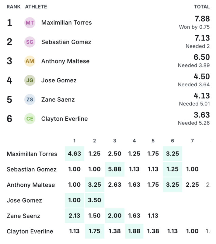El segundo lugar de Gómez fue casi un primero porque tuvo la mejor ola de la serie, un 5,88 producto de un techo en una sólida hacia Pipe. Quedó necesitando dos puntos que no logró conseguir.