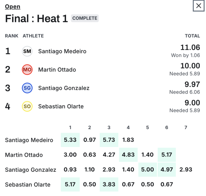 Medeiro sorteó con éxito las cinco series en las que compitió y terminó siendo clave para él que llegó tarde en la gran final, lo que hizo que quede bien colocado para su primera ola que terminó siendo determinante pare el resultado final.