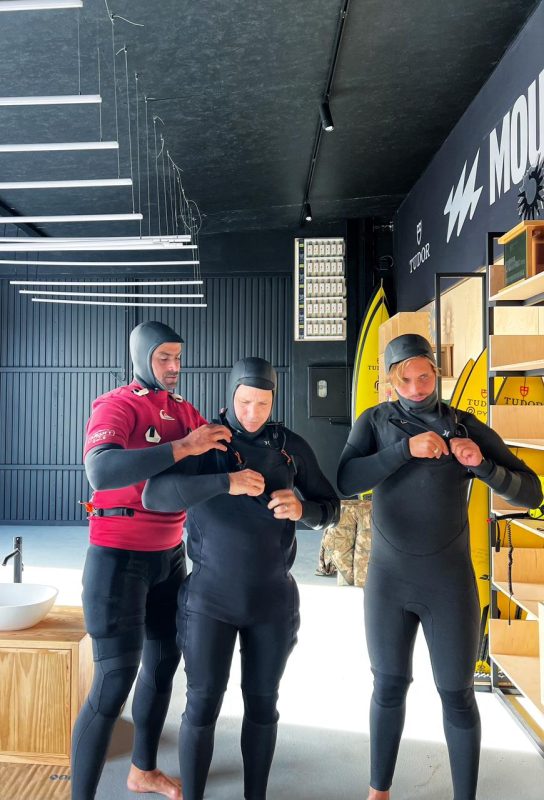 Él y todo su team estaban tan cansados de tres días de swell y cuando vio mi cara de las ganas que tenia de correr Nazaré, le dio mucha lastima de decirme que no. Me dijo: “Vamos a almorzar pollo para recargar energías y vamos para el agua”.