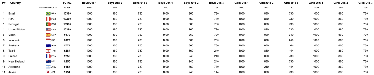 Perú, Brasil, Portugal y Estados Unidos terminaron la jornada 4 del ISA World Junior Surfing Championship empatados en primer lugar en el ranking parcial por equipos, todavía invictos con todos sus 12 competidores todavía con vida en el evento.