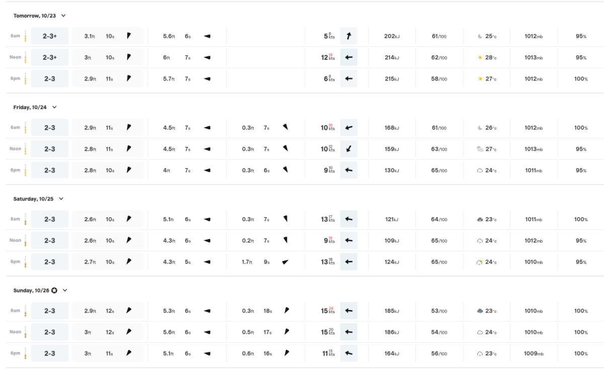 De acuerdo al comentario especializado de la mencionada web, el 26 será el mejor de los días porque, literalmente señalan: Se prevé un poco más de oleaje del NNE y olas divertidas. Melissa permanece en el Caribe, cerca de Jamaica. Se espera que Melissa permanezca en el Caribe, cerca de Jamaica. Se esperan brisas moderadas del ESE, por lo que las condiciones se mantienen decentes”.