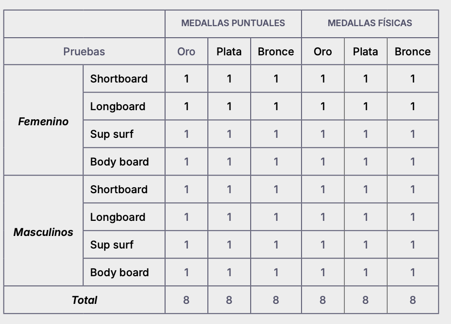 Serán cuatro las disciplinas las disputadas, shortboard, longboard, SUP Surf y Bodyboard, totalizando con los dos géneros ocho podios y se podrá inscribir un máximo de dos atletas por división por país, lo que significa que un equipo completo tendrá 16 competidores.