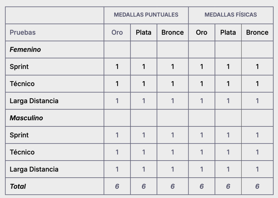Debajo la distribución de medallas de la disciplina: